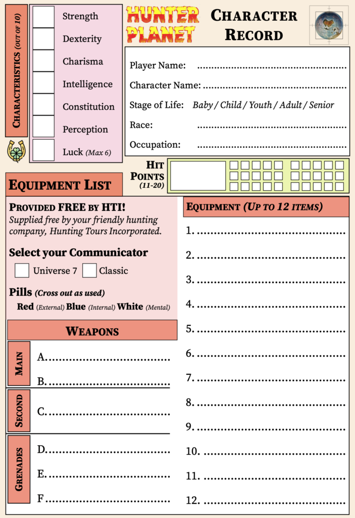 The very simple – but very important – Character Record Sheet contains space to record all you need to play Hunter Planet.
